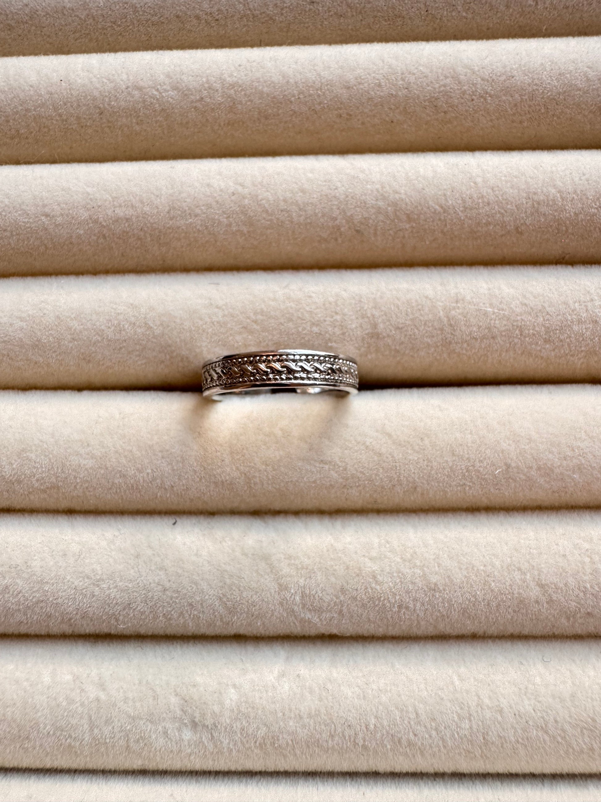 Elevate your jewelry collection with this exquisitely crafted band. Featuring a continuous etched pattern of intertwined scrollwork, this ring blends traditional artistry with a modern, low-profile silhouette. Whether worn as a unique wedding band, a stackable accent, or a standalone statement piece, its intricate texture catches the light from every angle.