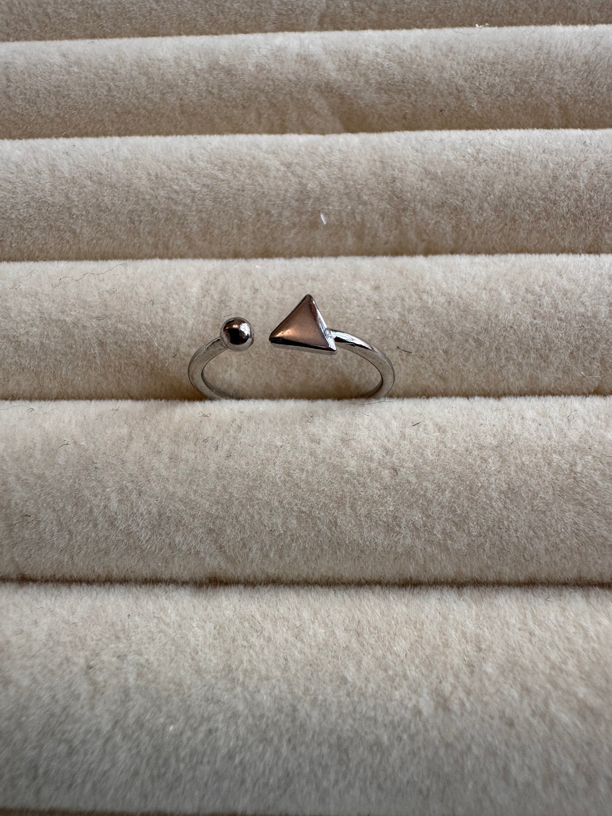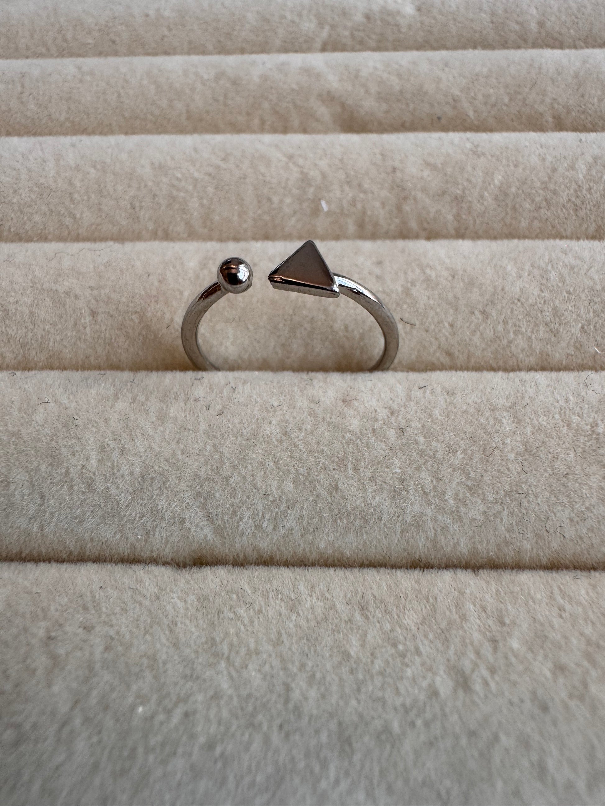 Discover the perfect blend of modern minimalism and striking geometry with our Geometric Open Cuff Ring. This captivating piece features a sleek, adjustable band that elegantly wraps around the finger, culminating in two distinct, polished ends: a smooth, perfectly spherical bead and a sharp, contemporary triangle.