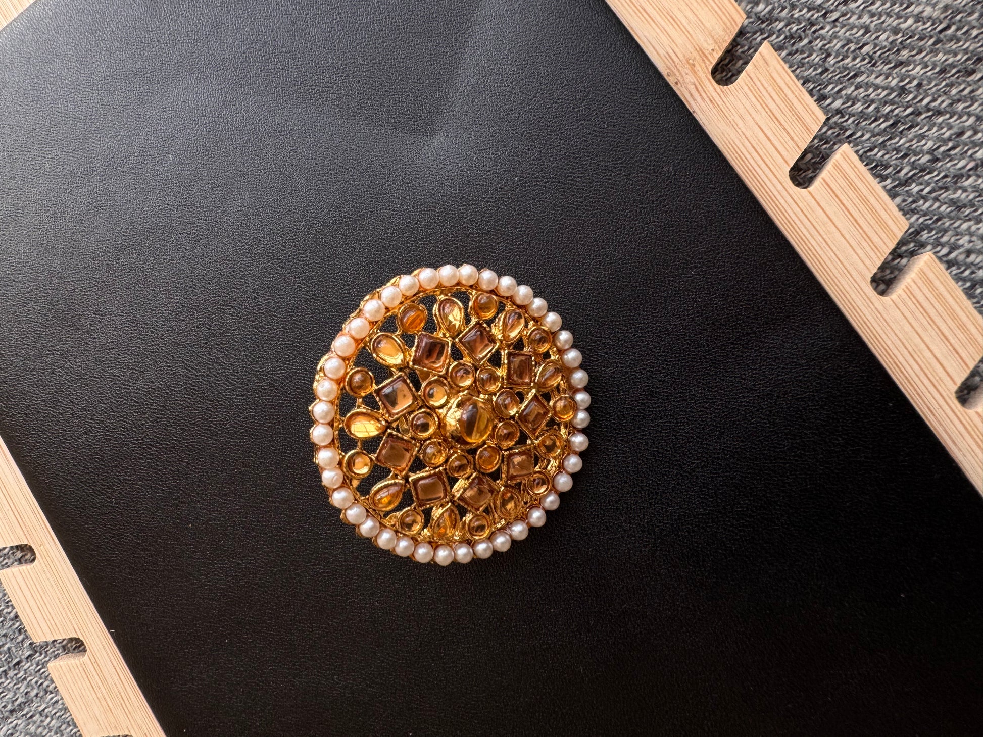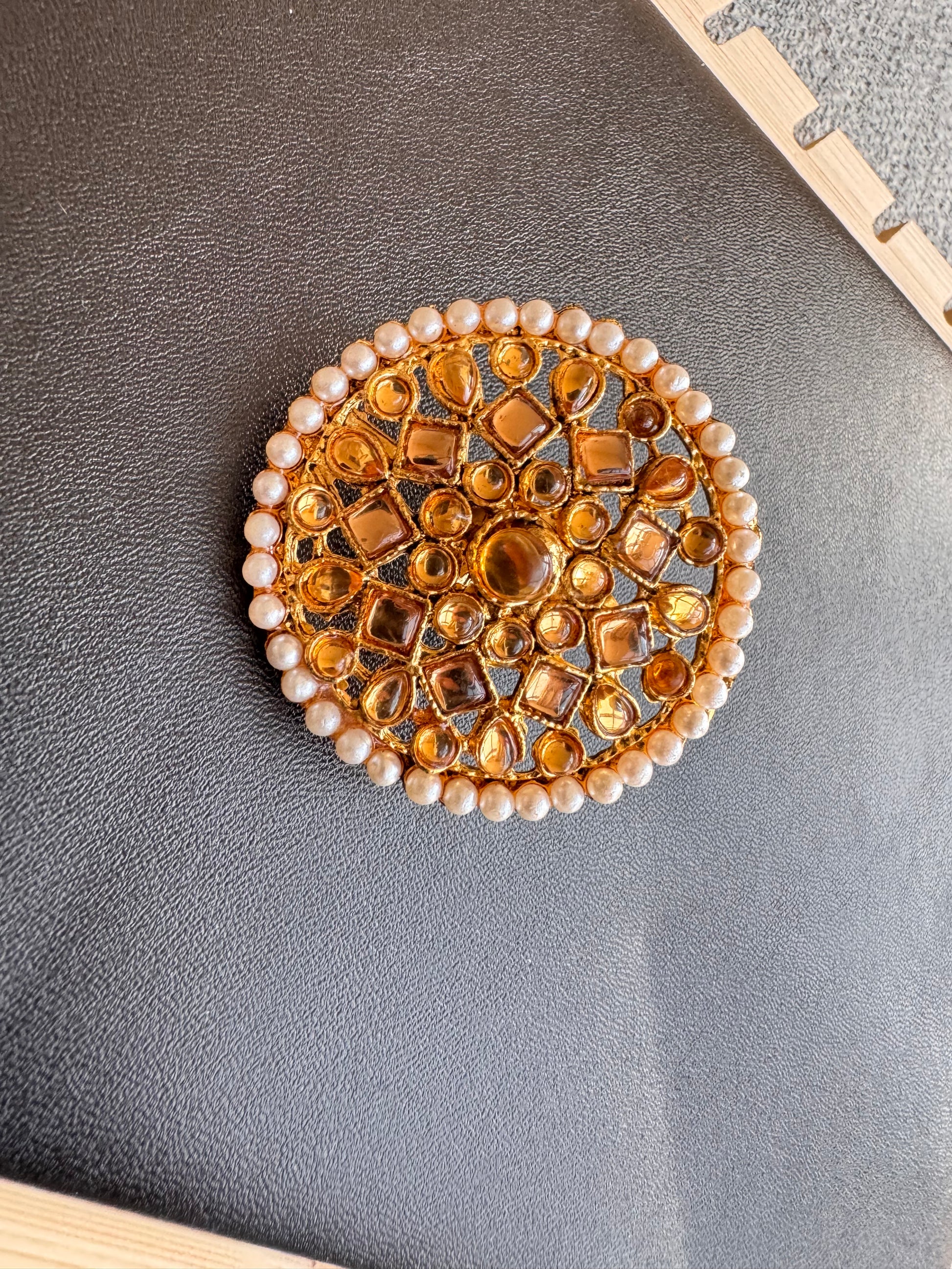 The large, circular face is intricately set with varied cuts of rich amber-toned Kundan-style stones, creating a mesmerizing mosaic of light and shadow. The centerpiece is encircled by a delicate, unbroken border of pristine faux pearls, lending an air of sophisticated royalty to the design.