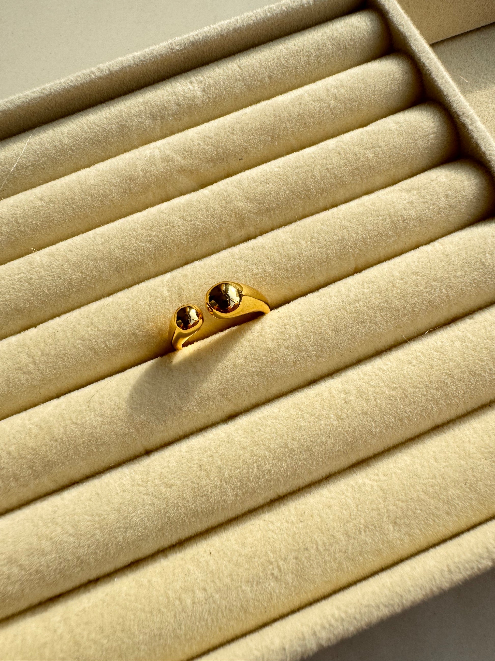 Embrace a modern, asymmetrical style with our Minimalist Duo Ring. This unique piece features two perfectly polished orbs of different sizes, elegantly positioned side-by-side on a slim, comfortable band.