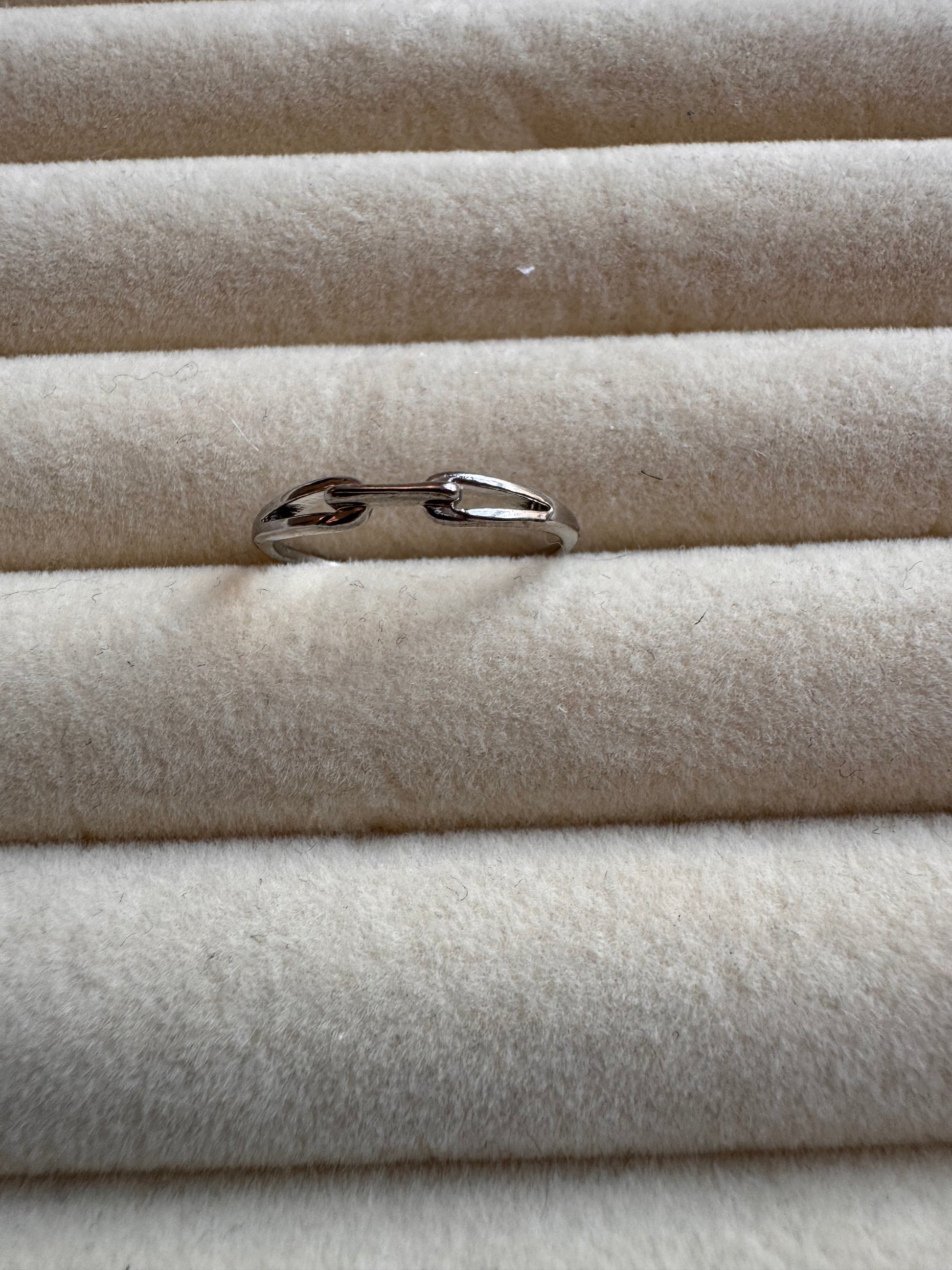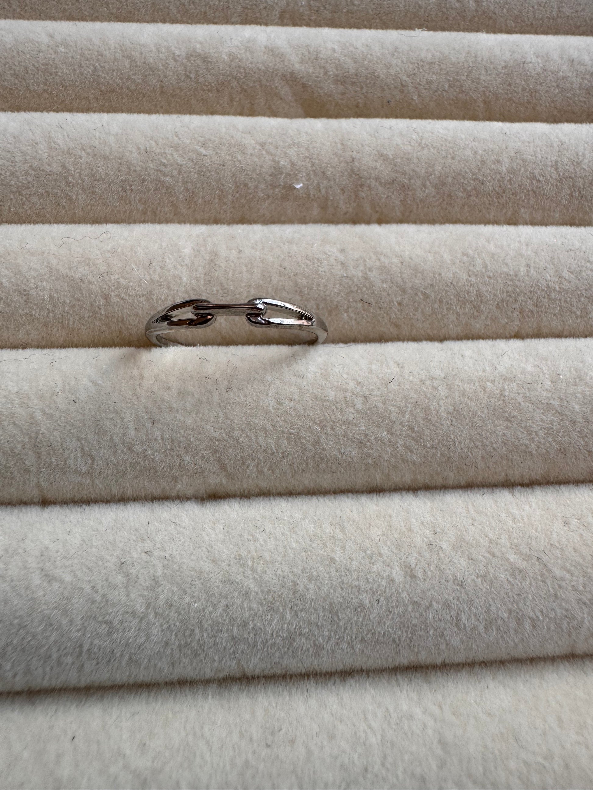 Refined Simplicity. Elevate your jewelry collection with this delicately crafted ring, featuring a unique interlinked geometric motif. Designed with a slim, high-polish band, this piece offers a modern twist on the classic silver ring. Its airy, open-link silhouette makes it the perfect anchor for a curated ring stack or a subtle, chic statement when worn alone.